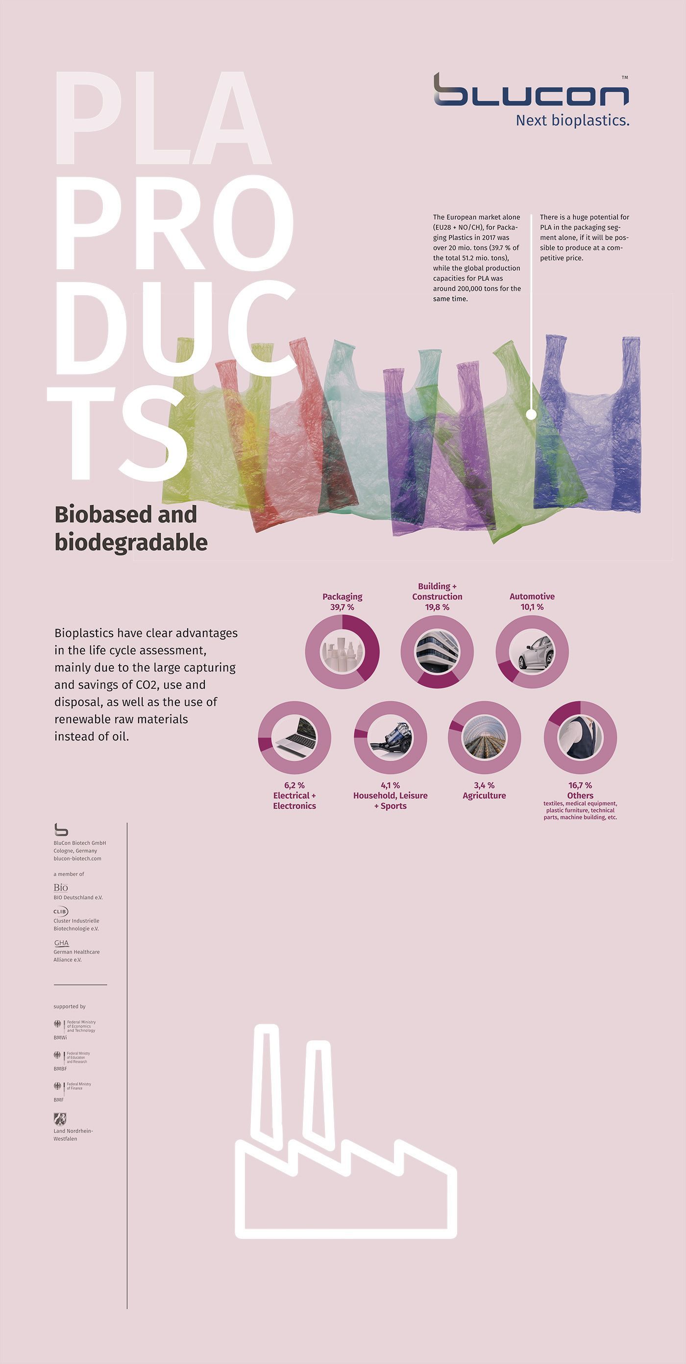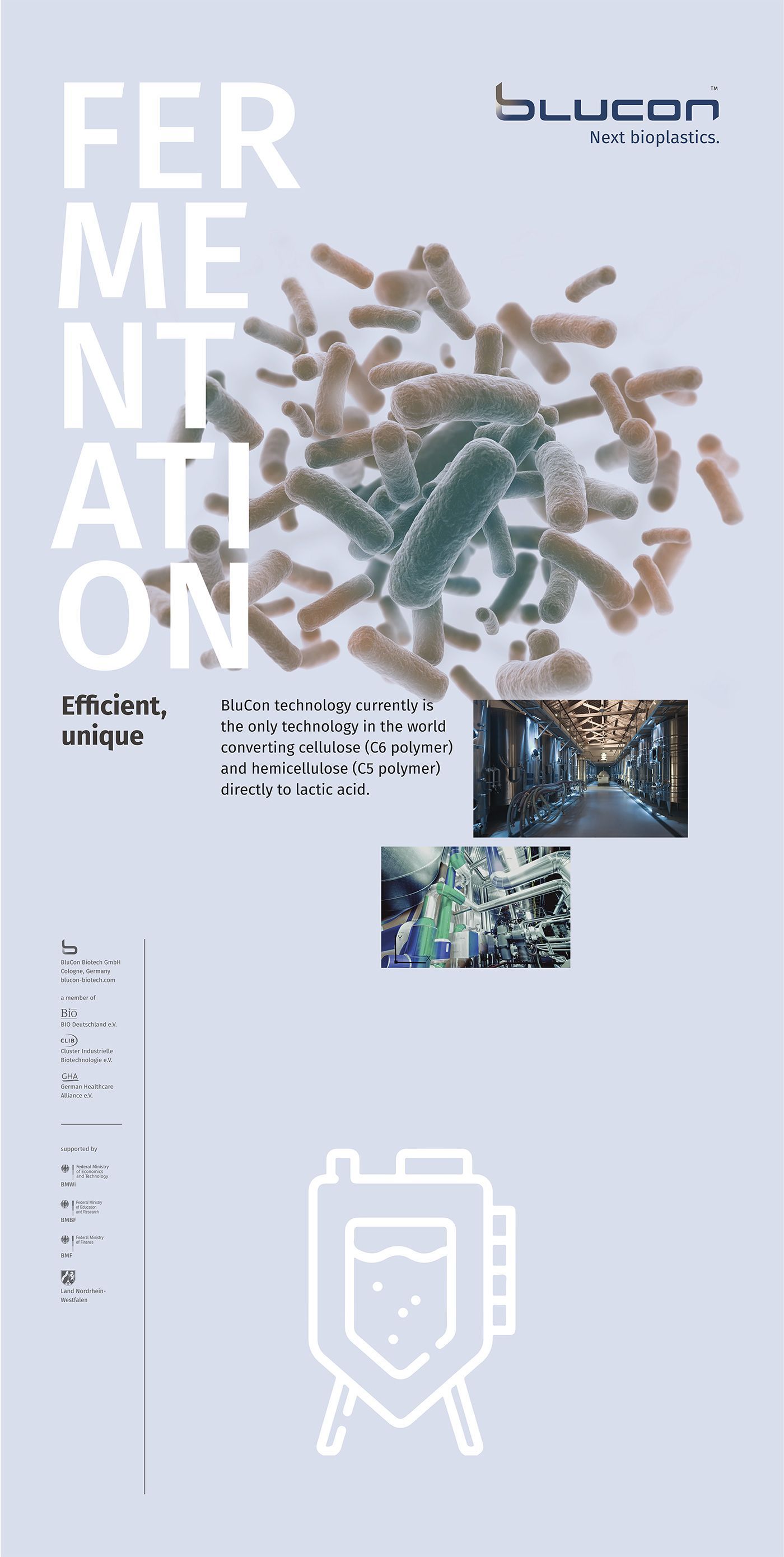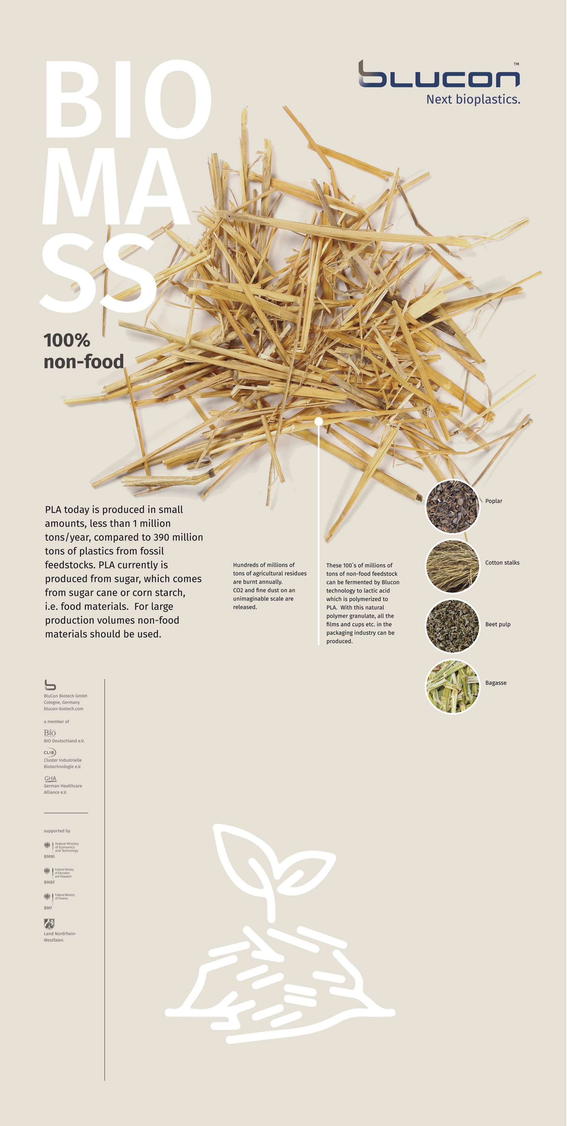 Zudem wird PLA aus Zucker hergestellt, der vorrangig aus Zuckerrohr oder Maisstärke, also aus Lebensmitteln, gewonnen wird. Die blucon-Technologie ist derzeit die einzige Technologie weltweit, die aus Non-Food-Materialien Zellulose direkt in Milchsäure umwandelt. Zum Beispiel kann aus Weizenstroh, das zum Beispiel in großen Mengen einfach nur verbrannt wird, mit dem blucon Verfahren große Mengen PLA plus weiterer Ressourcen schonende Stoffe wie Kalk und Leinöl produziert werden.
